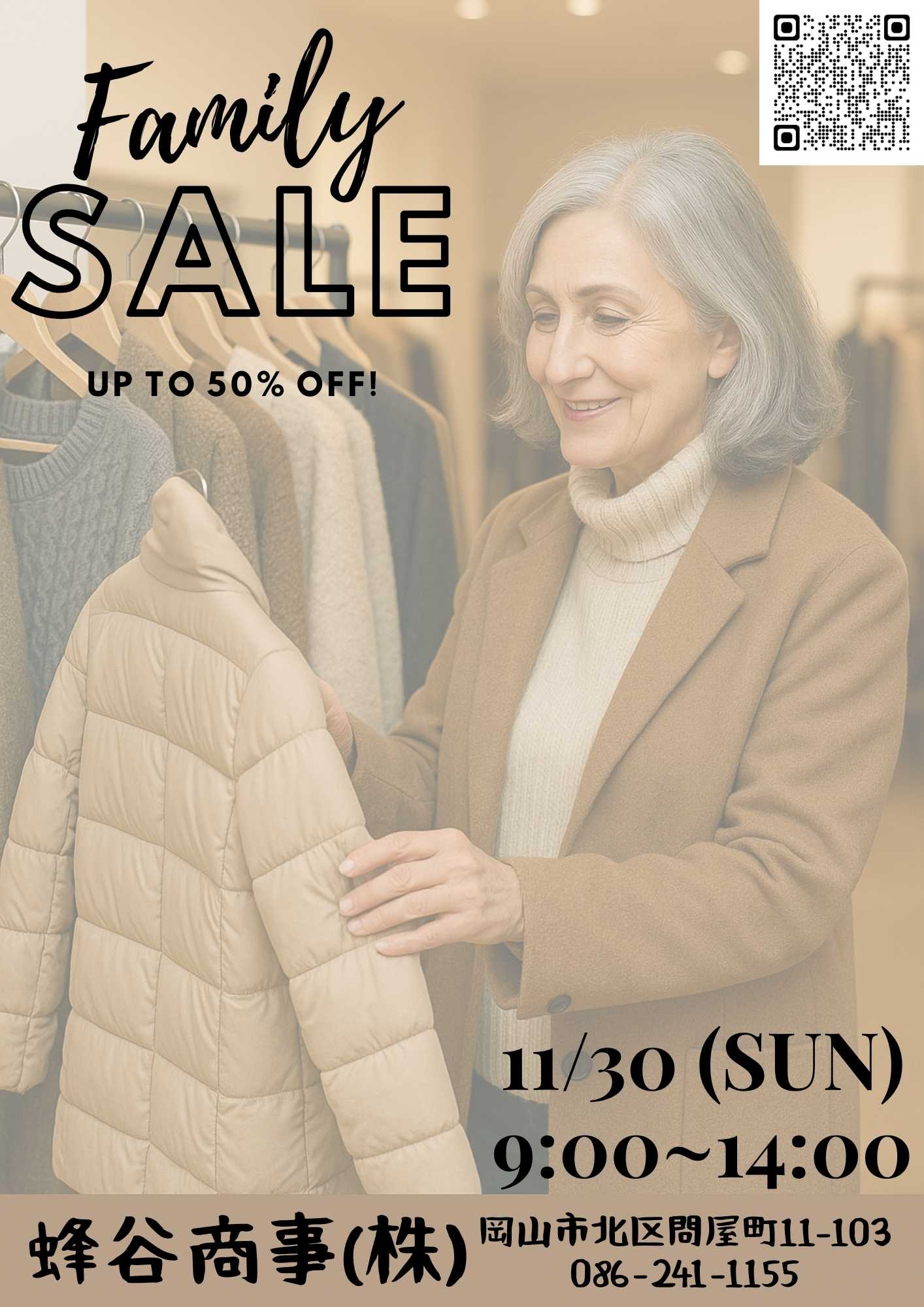 今月も「ファミリーセール」を開催いたします。 婦人服の冬アイテムを中心に、特別価格でご提供! どなたでもご来場いただけますので、お誘いあわせの上ぜひお越しください。